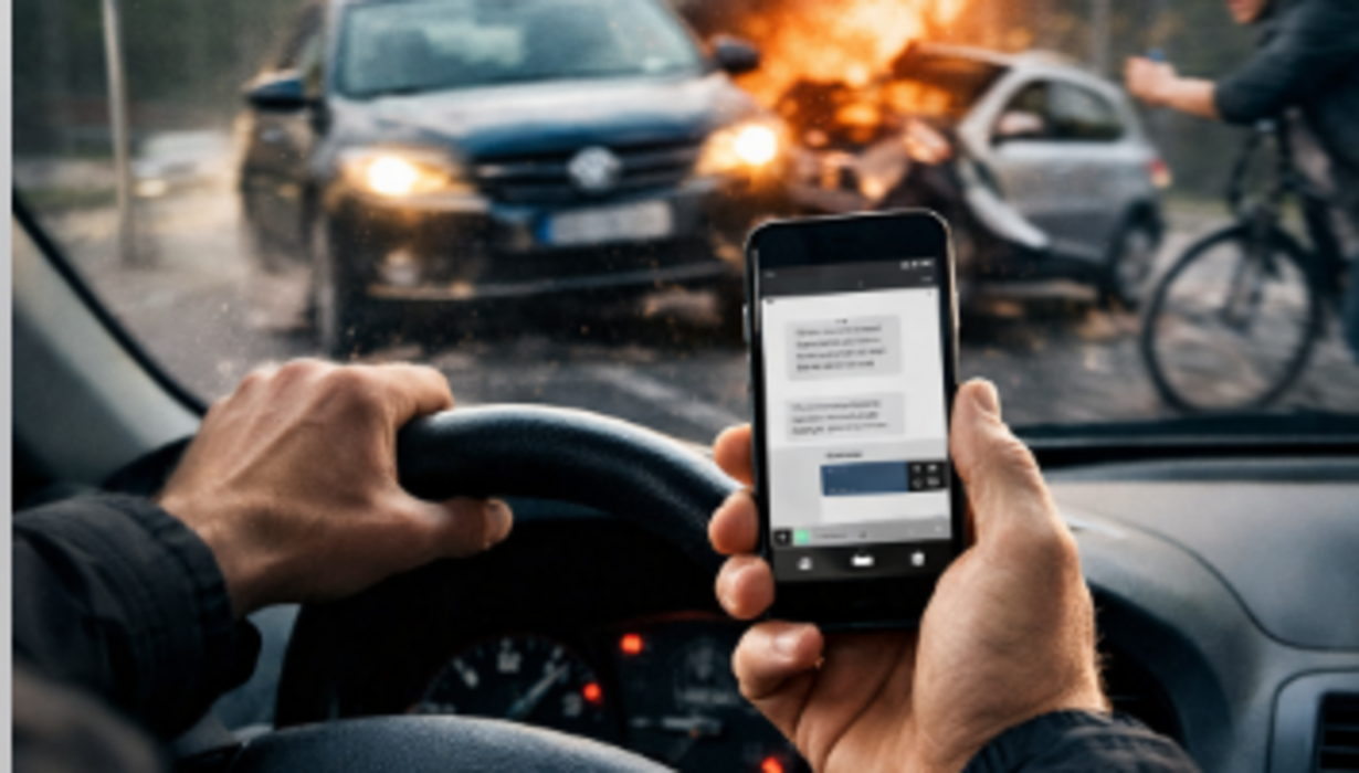 Im Vordergrund sitzt ein Autofahrer, der auf sein Handy schaut und dadurch abgelenkt ist. Im Hintergrund überqueren mehrere Personen den Zebrastreifen, während die Situation ruhig wirkt. Der Kontrast zeigt klar: Die Gefahr entsteht im Auto – nicht auf der Straße.