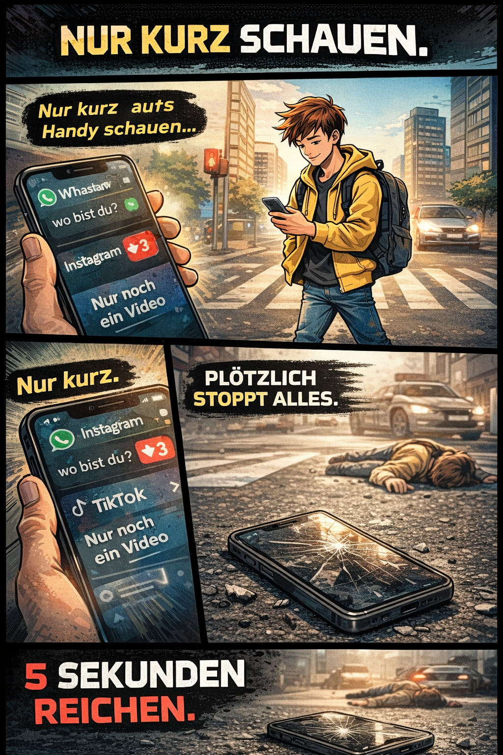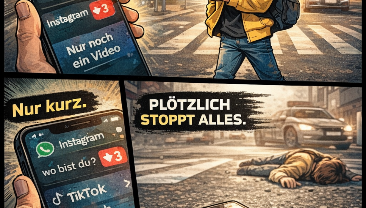 Der Comic zeigt, wie „nur kurz aufs Handy schauen“ zur gefährlichen Ablenkung wird. Likes, Nachrichten und Videos reißen den Fokus weg – bis plötzlich alles stoppt. Die Message ist klar: Schon wenige Sekunden Unaufmerksamkeit können alles verändern. Ablenkung killt Fokus. Und manchmal auch Leben.