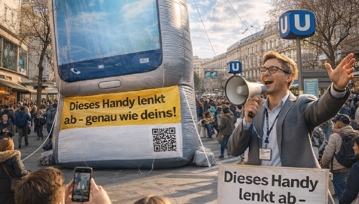 Aufstellung eines aufblasbaren Handys an verschiedenen Hot Spots in Österreich. Der QR Code führt zu Informationen über Sicherheit und Gefahren im Bezug aufs Handy auf der Straße. Es soll primär die Aufmerksamkeit der jungen Erwachsenen auf das wichtige Thema lenken.