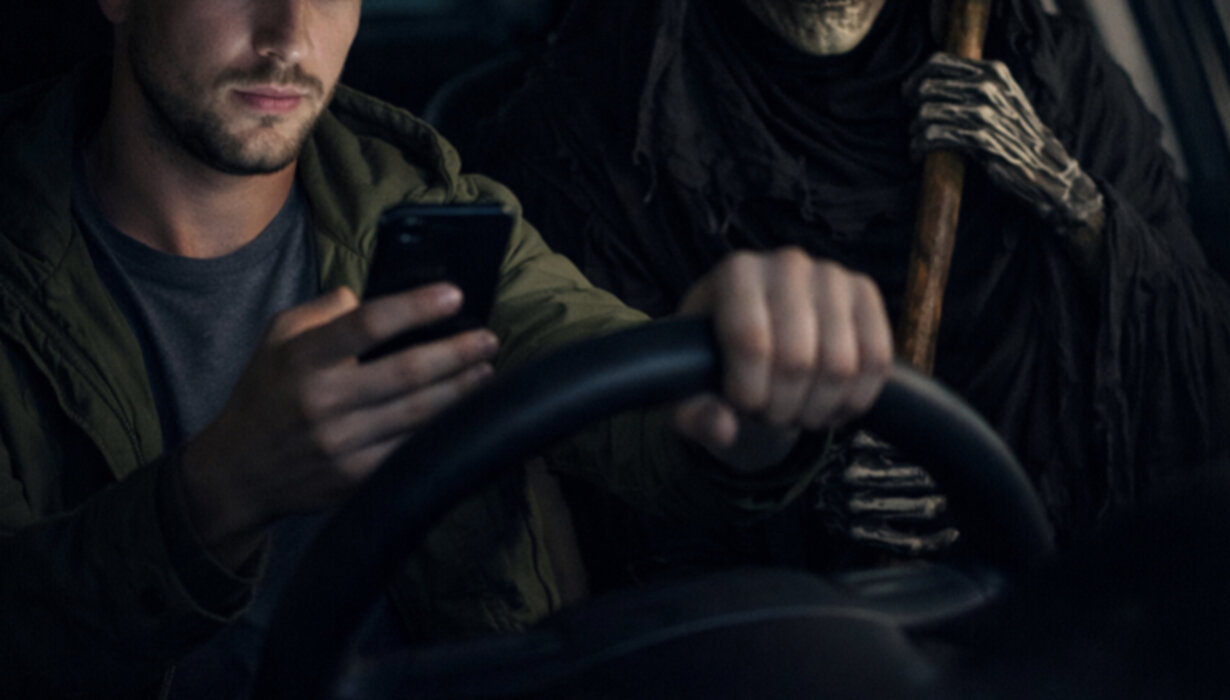 Das Bild zeigt eine eindringliche und sehr symbolische Szene, die sofort Aufmerksamkeit erregt. Im Mittelpunkt sitzt ein junger Mann am Steuer eines Autos. Er wirkt alltäglich gekleidet und könnte jeder gewöhnliche Autofahrer sein. Mit einer Hand hält er das Lenkrad fest, während er mit der anderen sein Smartphone in der Hand hat. Sein Blick ist deutlich auf den Bildschirm gerichtet und nicht auf die Straße vor ihm. Dadurch entsteht der Eindruck, dass er vollkommen abgelenkt ist und die Kontrolle über die Situation zunehmend verliert. Das schwache Licht des Handys beleuchtet sein Gesicht und verstärkt die konzentrierte, aber unvorsichtige Haltung.