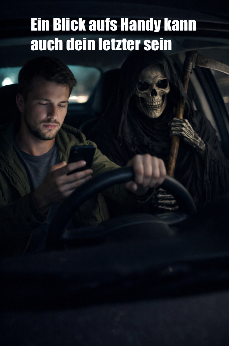 Insgesamt stellt die Darstellung eine klare Warnung dar. Sie macht sichtbar, dass Ablenkung im Straßenverkehr nicht harmlos ist, sondern im schlimmsten Fall tödliche Konsequenzen haben kann. Der Tod sitzt symbolisch bereits neben dem Fahrer – bereit einzugreifen, sobald ein Moment der Unaufmerksamkeit zum Unfall führt. Damit erinnert das Bild eindringlich daran, wie wichtig Konzentration und Verantwortung am Steuer sind.