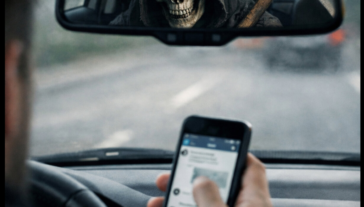 Insgesamt zeigt das Bild, wie leichtfertig und unbewusst Menschen sich selbst und andere in Gefahr bringen können, wenn sie ihr Handy während der Fahrt benutzen. Der Tod steht sinnbildlich für die möglichen Folgen dieser Ablenkung: schwere U